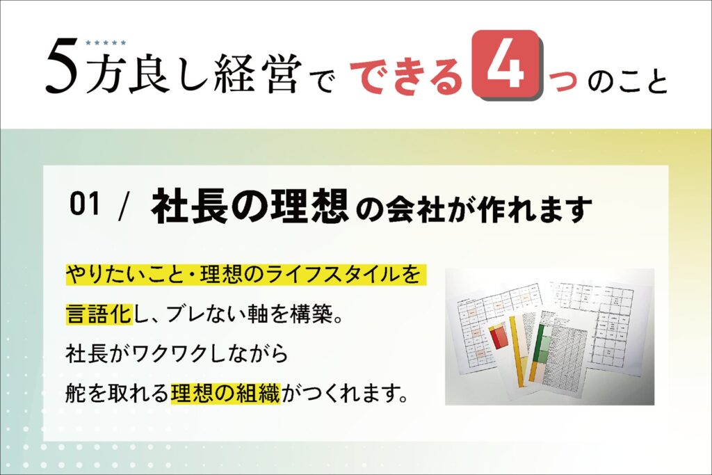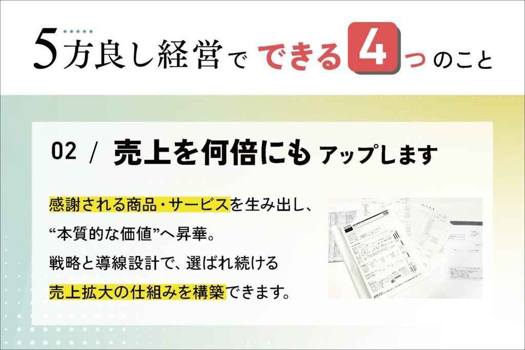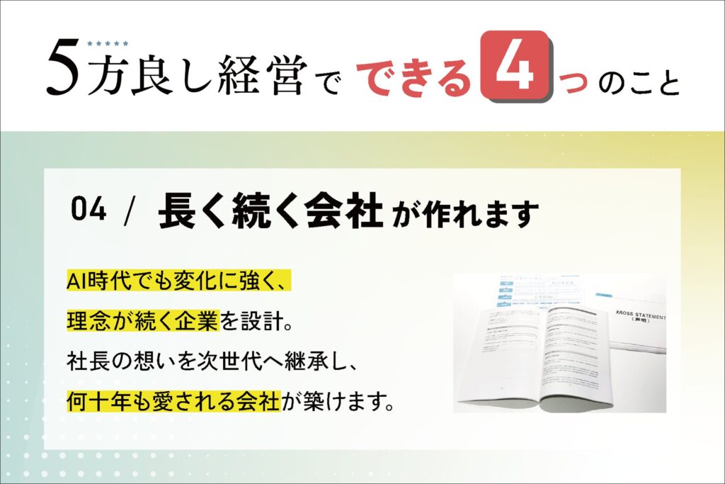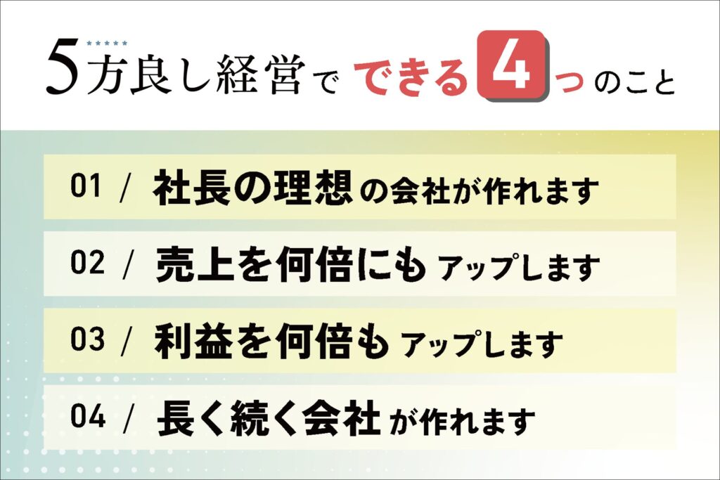 会社・従業員・顧客・世間・次世代の5つを同時に良くする経営の考え方を具体的に解説します。