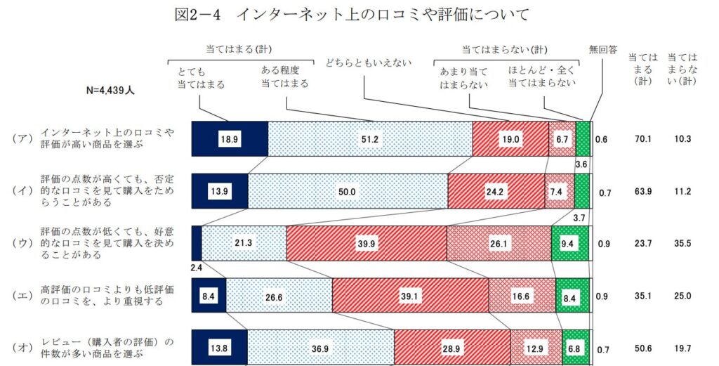 現代の消費行動において、口コミやレビューは購入決定における最重要要素の一つです。消費者庁の「令和5年度消費者意識基本調査」(※1)によると、約7割の消費者が「口コミや評価が高い商品を選ぶ」と回答しており、SNSやレビューを参考にすることが当たり前となっています。