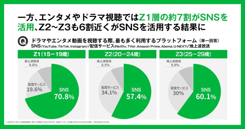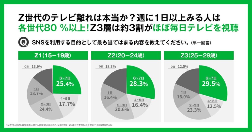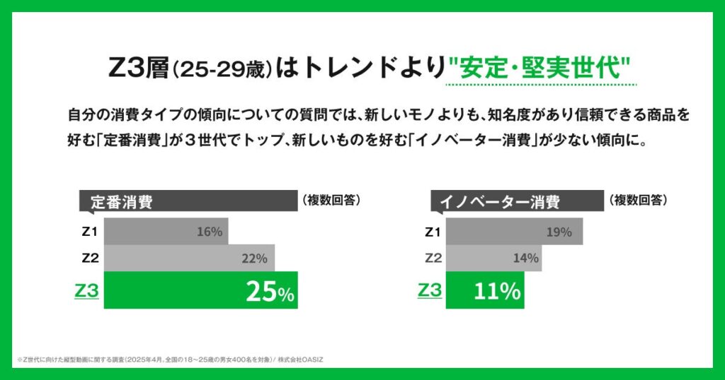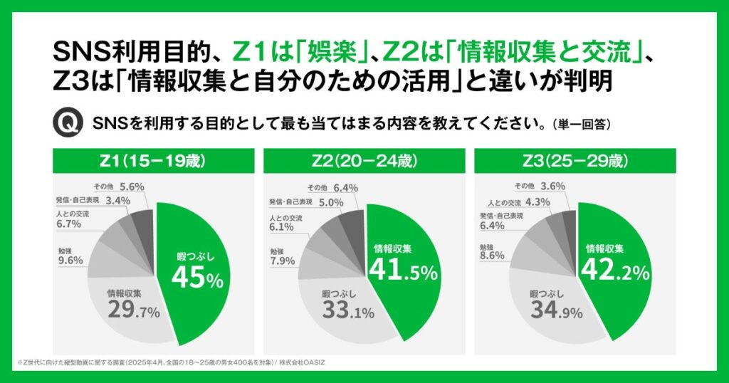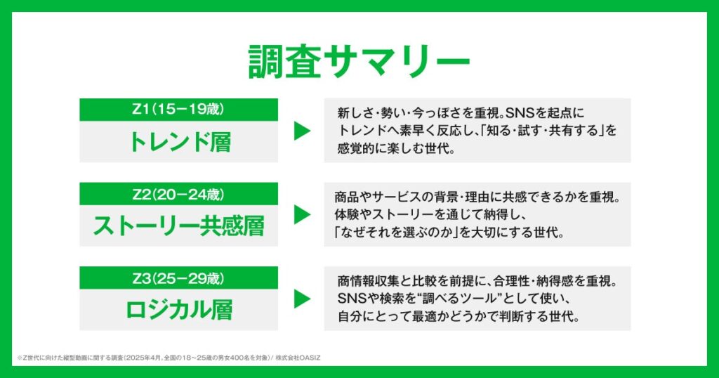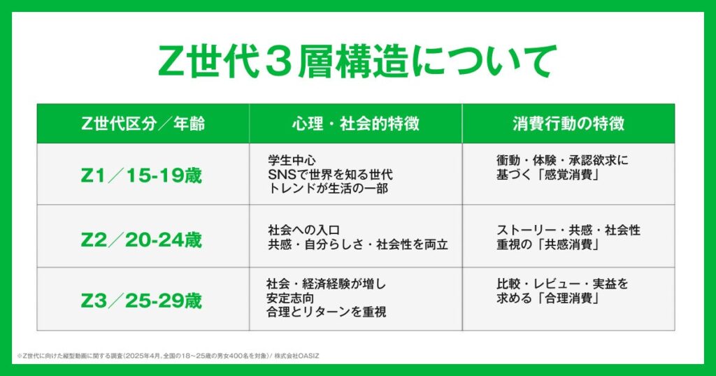 TikTokなどの縦型ショート動画に特化したネクストジェネレーションカンパニー、株式会社OASIZは、全国の15〜29歳の男女を対象に「Z世代の消費意識・SNS利用実態」に関する調査を実施。一括りに語られがちなZ世代ですが、本調査の分析を通じて、「Z1(15〜19歳)」「Z2(20〜24歳)」「Z3(25〜29歳)」の3層において、消費行動や価値観に明確な違いがあることが明らかになりました。トレンドで即購入する“Z1”、ストーリーで選ぶ“Z2”、比較検討で納得して買う“Z3”、一括りでは語れない“3層Z時代”の実態をお伝えします。