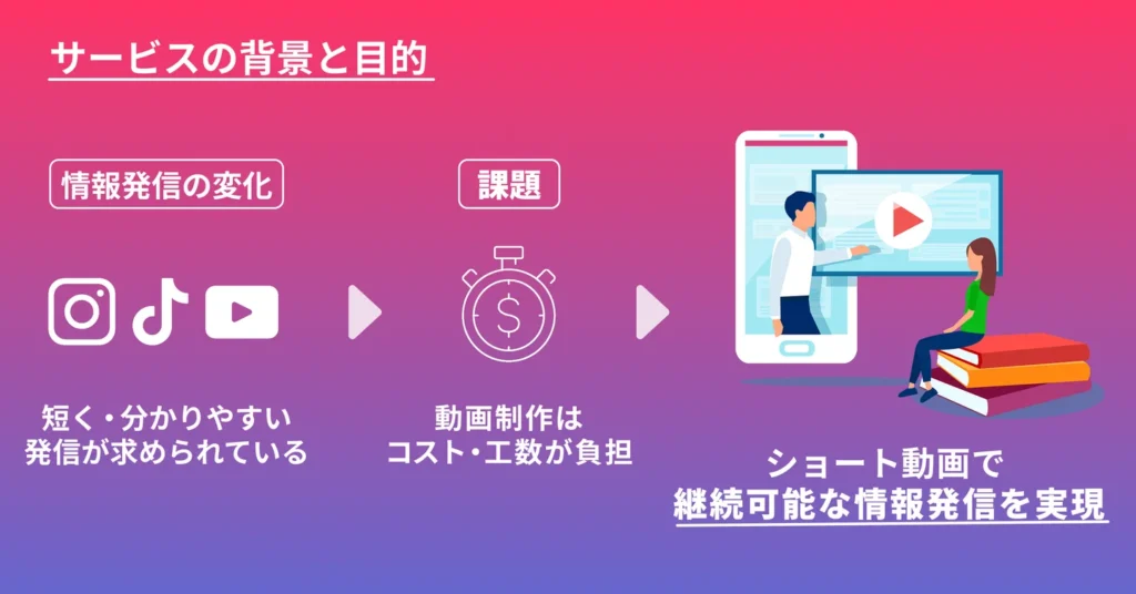 近年、SNSや動画プラットフォームの普及により、企業の情報発信において「短く・分かりやすく・継続的に伝える」ことの重要性が高まっています。一方で、動画制作にはコストや工数がかかるという理由から、十分に活用できていない企業も少なくありません。