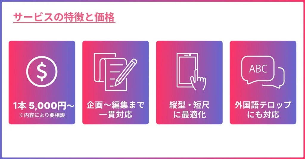 本サービスでは、1本あたり5,000円〜の導入しやすい価格帯で、ショート動画制作を提供しています。