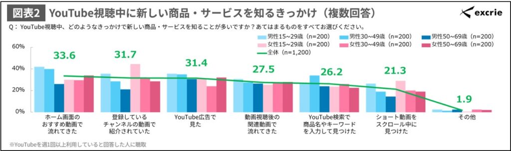 YouTubeを週1回以上利用していると回答した人に、YouTube視聴中に新しい商品・サービスを知るきっかけを聴取しました。「ホーム画面のおすすめ動画で流れてきた」が33.6%と最も高く、特に男性15~49歳では他セグメントより高くなりました。「登録しているチャンネルの動画で紹介されていた」については女性15~29歳で高く、「ショート動画をスクロール中に見つけた」については男女ともに15~29歳で割合が高くなっています。(図表2)
