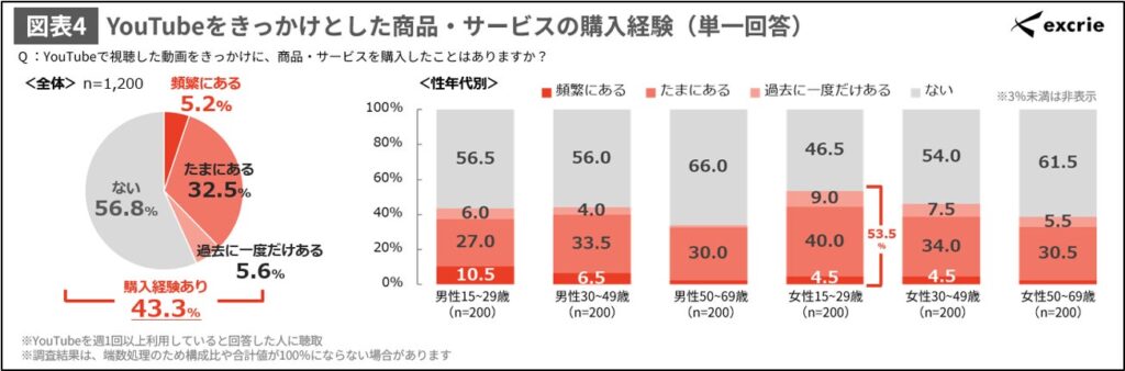 43.3%の人がYouTubeをきっかけに商品を購入した経験あり、女性若年層では5割超