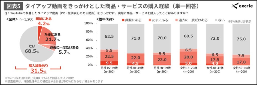 YouTubeに投稿されたタイアップ動画をきっかけとした商品・サービスの購入経験について、全体のうち31.5%の人が購入したことがあると回答しました。特に、男女15~29歳の購入経験率が高くなっています。(図表5)