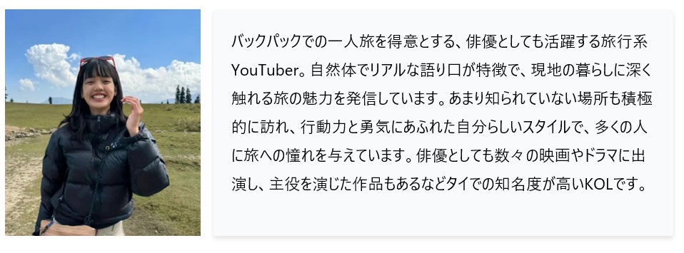 インバウンド・バズおよび兄弟会社のDTK AD CO.,LTD.(ディーティーケーアド)は、以下3組のタイ人KOLと契約しています。3組全て、日系企業・団体のマーケティング施策に起用することができるのはインバウンド・バズとDTK ADのみで、独占契約をしています。